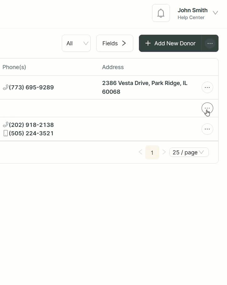 - Once you find the donor record, click the Action menu, denoted by three (3) dots, to the right, then click Edit.