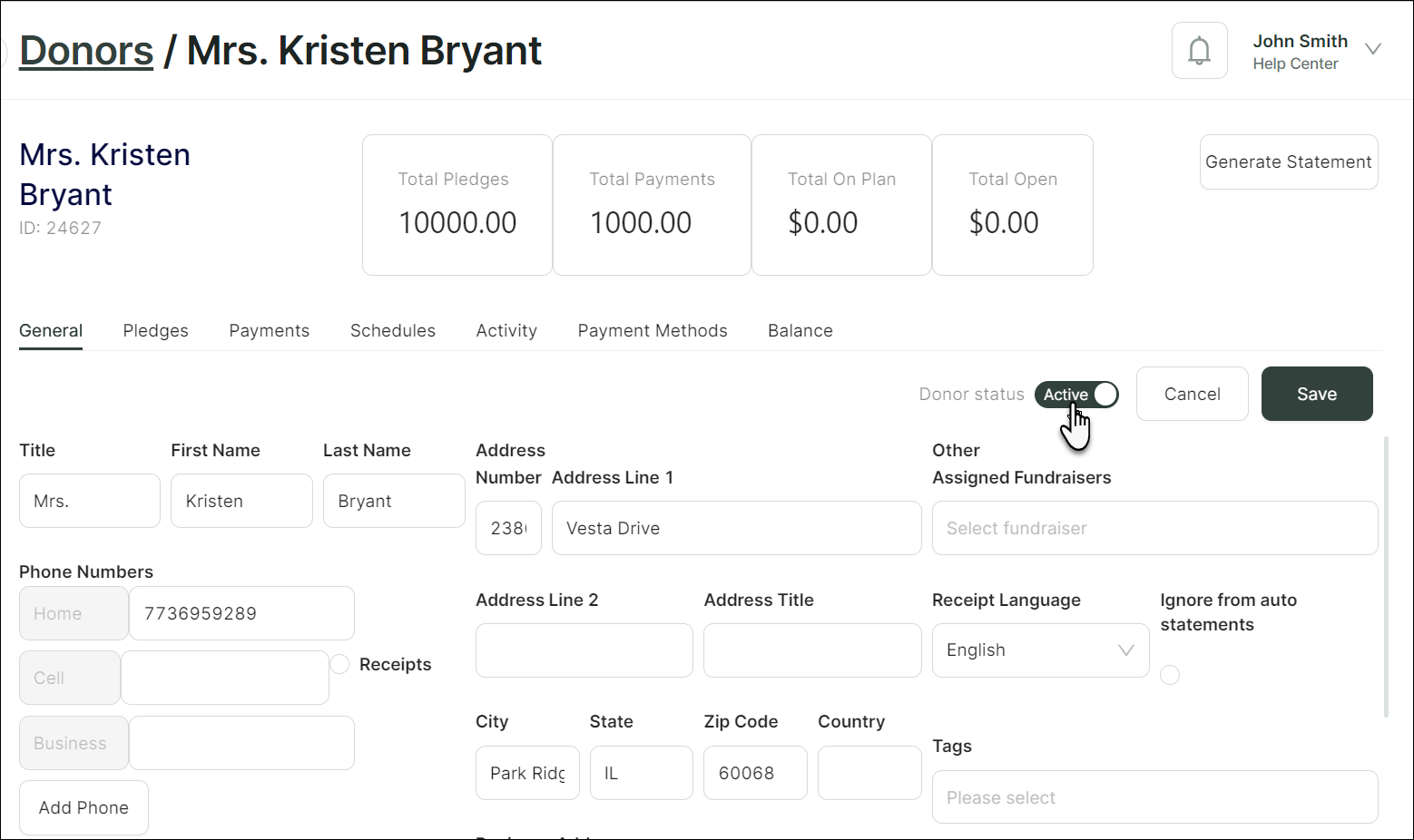 - On the Edit Donor page, toggle the Inactive button on the topmost right and change the record's status to Active.