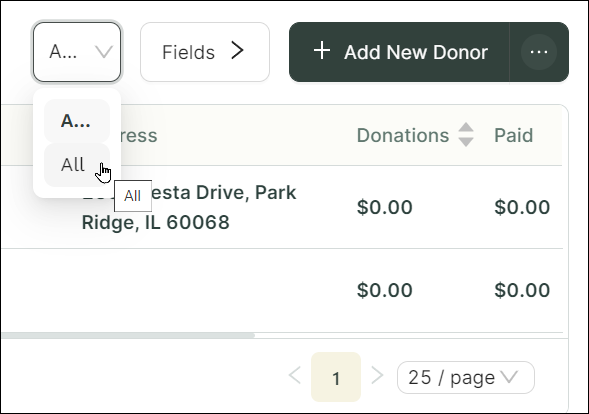 - On the Donors page, all inactive donor records are hidden from view. To view inactive donors, change the default Active filter on the Donors page to All, meaning all records regardless of status (active or inactive). For more information, see To Change the Status Filter on the Donors Page from Active to All.