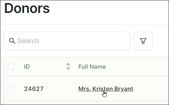 - Once you find the donor record, click on the donor's name under the Full Name column of the record. Alternatively, click the Action menu, denoted by three (3) dots, to the right, then click View Details.