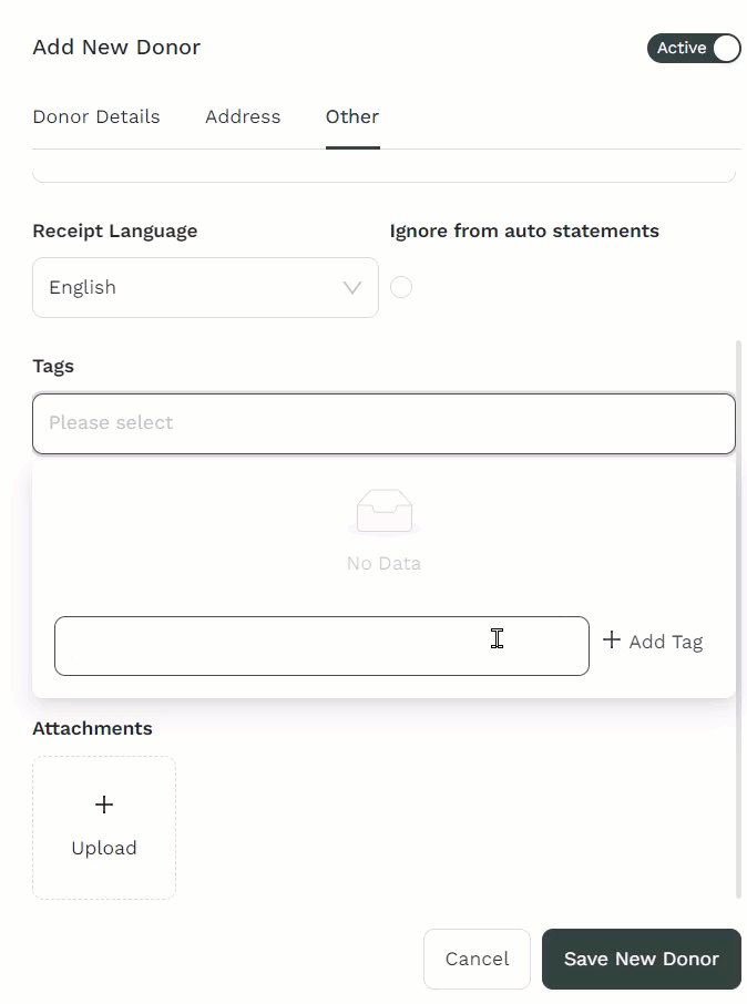 - Select a tag, if any, for the donor. If you have not set up tags previously, click the Tags box, enter the tag name, then click the Add Tag button. The system then adds the tag, which you can also use for other donors. You may add as many tags as needed.