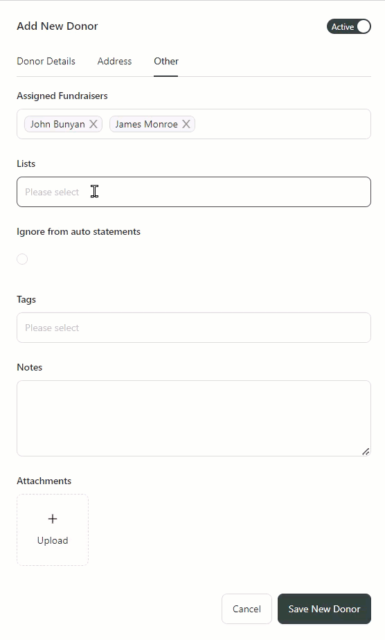 - To add miscellaneous details prior to saving the donor record, see Add a Fundraiser and Other Details to a Donor Record. If you do not want to enter any other details to the record at this time, click Save New Donor to add the new donor to the list on the Donors page.
