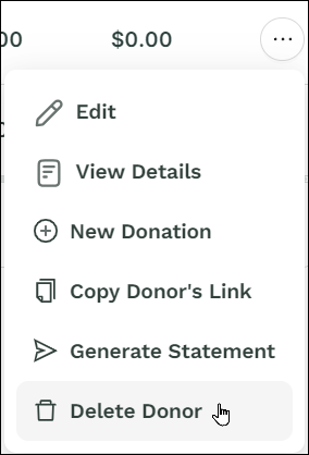 - Once you find the donor record, click the Action menu, denoted by three (3) dots to the right, then click Delete Donor.